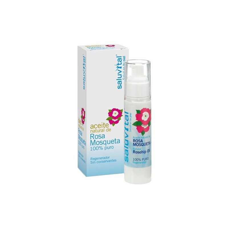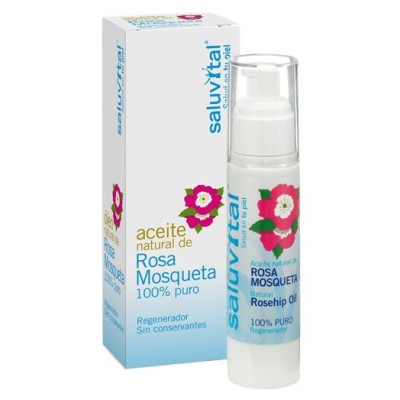 El Aceite Puro de Rosa Mosqueta Saluvital, obtenido por primera presión en frío, presenta un elevado contenido en ácidos grasos esenciales, aproximadamente un 80 % de su composición, que le confieren excelentes propiedades regeneradoras. Tambien contiene carotina, flavonoides, y vitamina C, así como tretinoina natural, un derivado del retinol (vitamina A), que estimula la regeneración del tejido epidérmico. Atenúa cicatrices, estrías y arrugas, previene el envejecimiento prematuro de la piel y difumina las manchas de la misma.