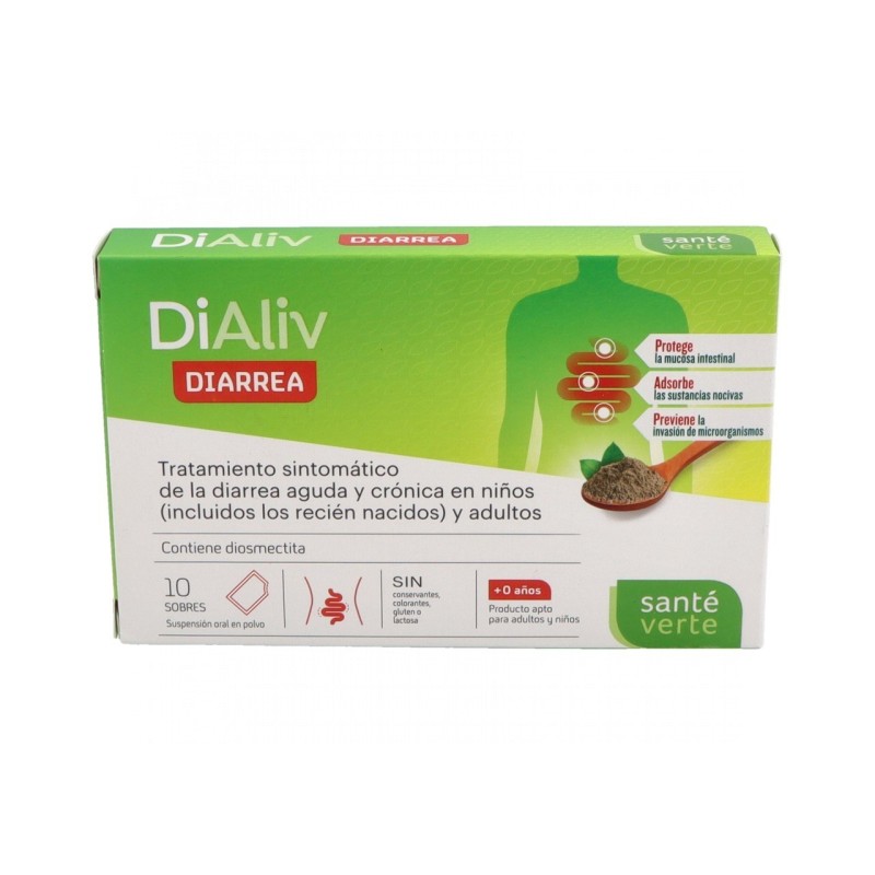Descripción: Santé Verte Dialiv Diarrea es un producto sanitario diseñado para el tratamiento sintomático de la diarrea aguda y crónica. Basado en la Diosmectita, crea una barrera física en la membrana mucosa intestinal, reduciendo la absorción de sustancias nocivas y previniendo la invasión de virus, toxinas o bacterias. Apto para niños (incluidos recién nacidos) y adultos, proporciona protección y alivio durante episodios de diarrea.