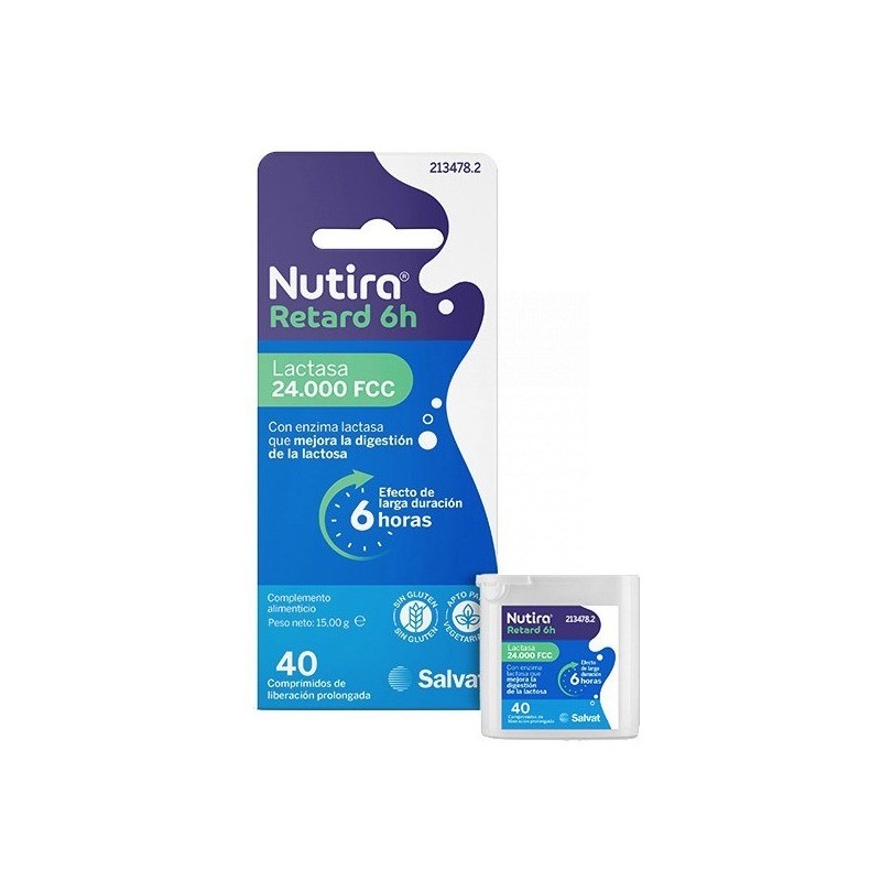 Cada comprimido de Nutira Retard 6h Lactasa 24.000 FCC contiene lactasa 24.000 FCC, la enzima crucial para descomponer la lactosa en glucosa y galactosa, facilitando su absorción.